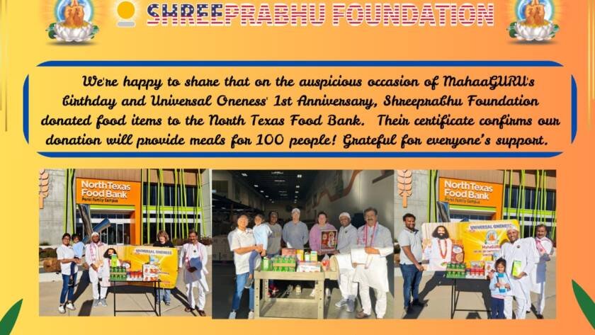 On December 7, 2024, Shreeprabhu Foundation joyfully marked the sacred occasion of MahaaGURU’s birthday and the 1st Anniversary of Universal Oneness by offering food items at the North Texas Food Bank (NTFB), Perot Family Campus, Plano, Texas.